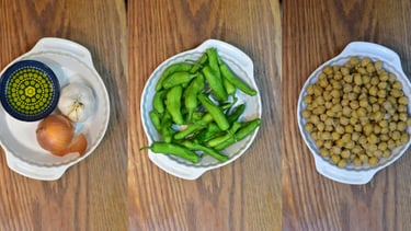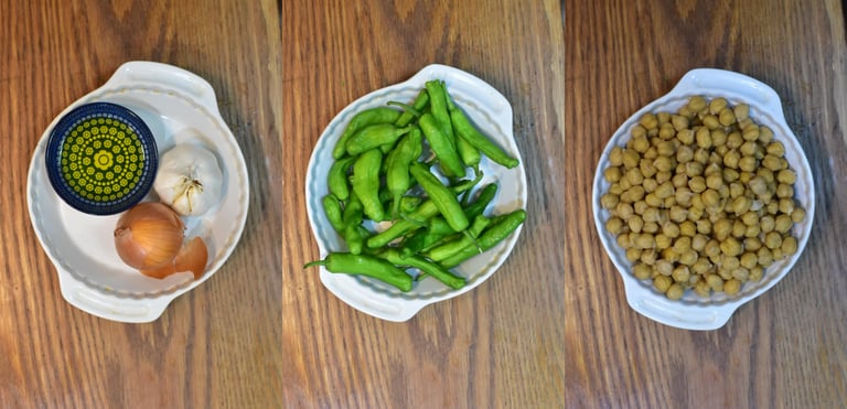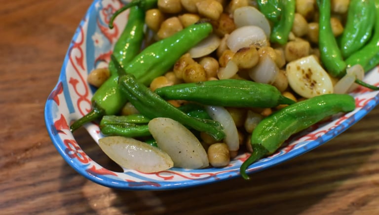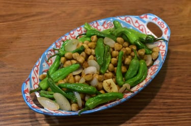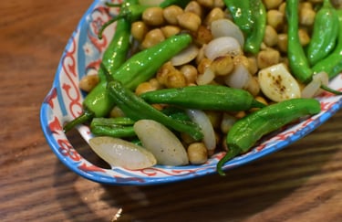 Here's a quick and delicious chickpea recipe. I paired it with a current favorite of ours: shishito peppers. These peppers from Japan are delicious pan-grilled with just olive oil and salt. I added chickpeas and aromatics to the mix to make it heartier. You can use bell peppers instead if you like it sweet; shishito peppers can be "risky" for people who don't like spicy foods as one in 10 of them are hot. Enjoy!