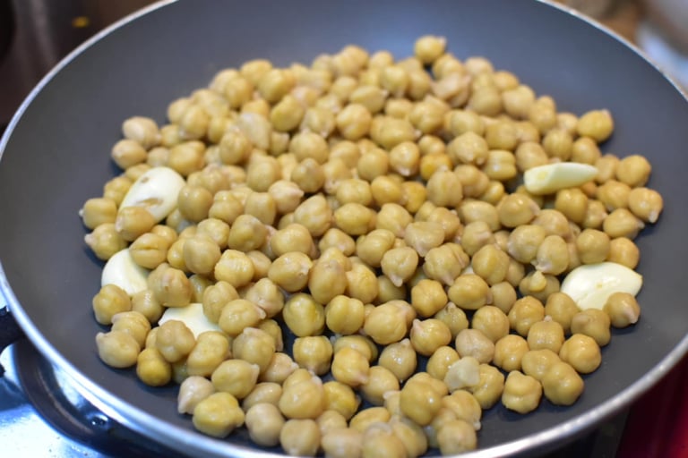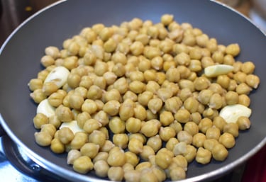 On medium heat, heat up the pan and pan-grill the chickpea and garlic (without any oil) for a few minutes, then add the peppers and onions. The goal is to get a mild sear on the ingredients. Stir or shake to avoid burning them.