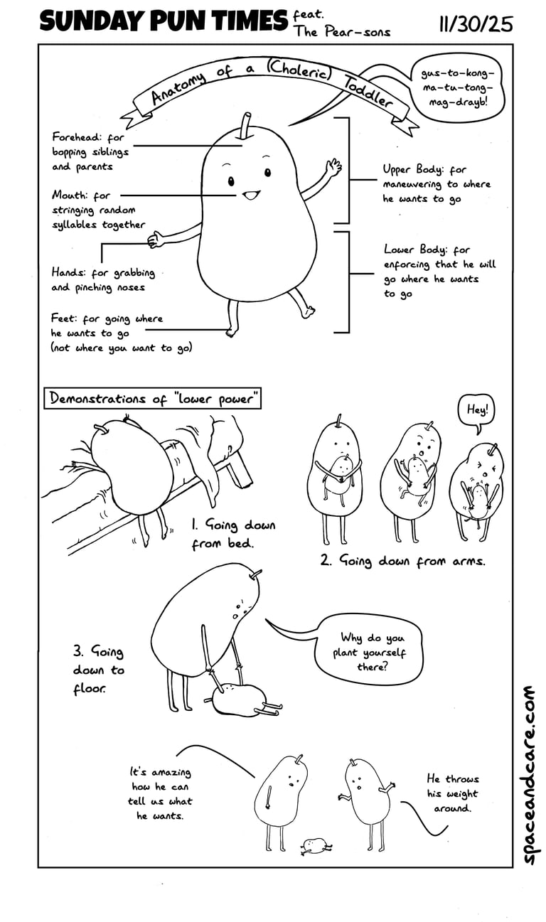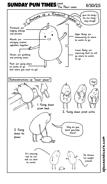 UPDATE: Here's an experimental expansion of Sunday Pun Times. Still no panel borders, but there is a sequence of events as in multiple-panel comics. I found the pears that I was drawing funny enough to give them more airtime than the other SPT random characters. Here, they are known as the Pear-sons (just go with it). I hope you enjoy it!-NL
