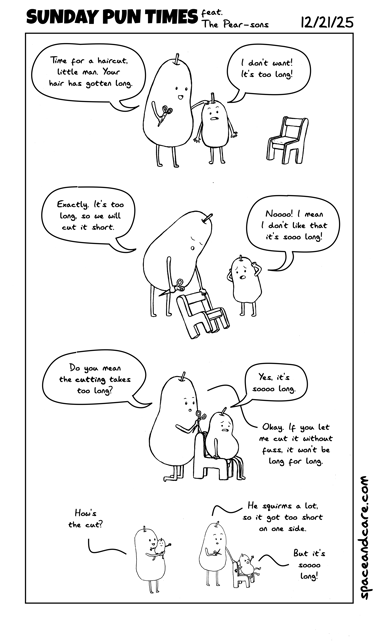 UPDATE: Here's an experimental expansion of Sunday Pun Times. Still no panel borders, but there is a sequence of events as in multiple-panel comics. I found the pears that I was drawing funny enough to give them more airtime than the other SPT random characters. Here, they are known as the Pear-sons (just go with it). I hope you enjoy it!-NL